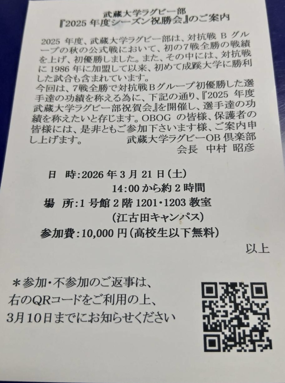 今回は、7戦全勝で対抗戦Bグループ初優勝した選手達の功績を称える為に、上記の通り、『2025年度武蔵大学ラグビー部祝賀会』を開催し、選手達の功績を称えたいと存じます。OBOGの皆様、保護者の皆様には、是非ともご参加下さいます様、ご案内申し上げます。